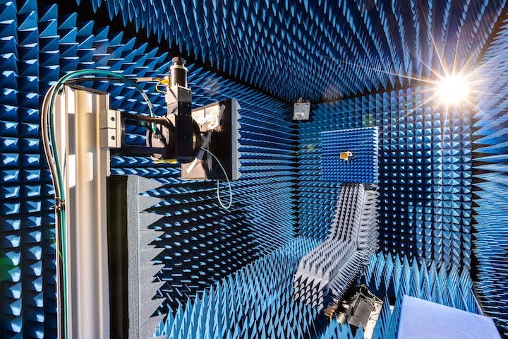 - Intentional Radiator: The device emits a wireless signal like Bluetooth, cellular, or Wi-Fi. Intentional radiators most often fall under the certification authorization requirement (with some exceptions being carrier current systems and AM transmission systems used in educational systems). Testing is performed in an anechoic chamber, (see figure below), which is designed specifically for isolating the EM radiation emissions from your product. These rooms are very expensive to rent – up to $1,000 per hour.