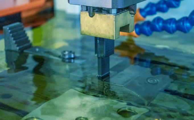 The EDM process consists of a metal part being submerged in dielectric fluid, where an electrically charged wire is then fed through the submerged metal component to make the precise cuts.
