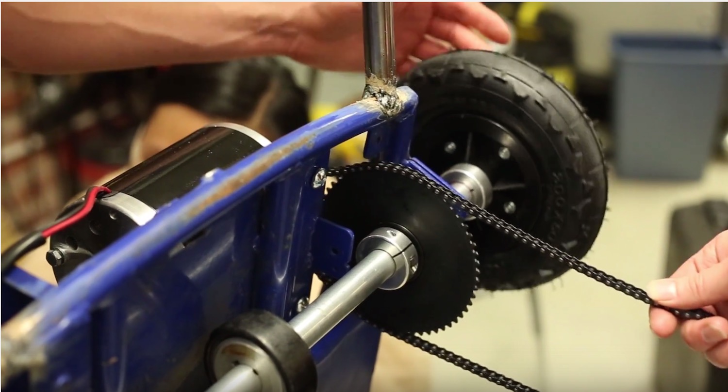 After plugging and playing with several numbers, we found that an 800-watt DC motor with a 1000-watt motor controller would best suit our needs. Also, because we valued acceleration over top-speed, we decided that we would need more torque than what the current 1:3 motor sprocket to axle sprocket ratio provided.