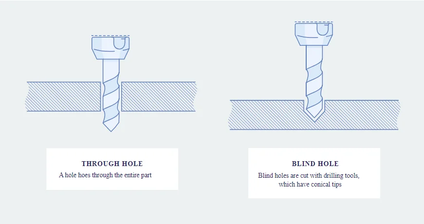Blind Holes Versus Through Holes: Blind holes do not go through a part, whereas through holes do. Understanding the differences between blind and through-holes is critical for making informed choices in the design and machining stages.